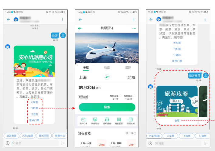 基于终端原生的短信消息入口,5G消息Chatbot形态不仅能以富媒体(包括文本、图片和音视频)形式呈现消息内容,还可以顺利获得多种形式的交互卡片、自定义按钮以及聊天式交互,随时与用户研讨,为用户给予更便捷、智能、人性化的服务。其智能聊天服务可应用于智能客服、智能问答、兜底消息等场景,为五一出行给予便捷、高效的业务咨询、智能推荐;为游客给予全时服务,助力其轻松攻略。